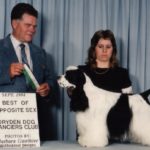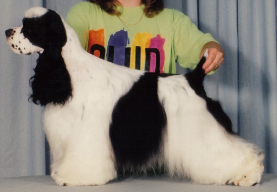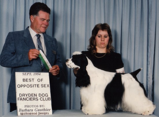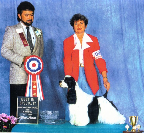 In 1994 I acquired a co-ownership of Dream from her breeder/owner Geri Mozel and she became my first parti colour cocker. She easily obtained her Canadian Championship at a year of age and was the winner of the American Cocker Spaniel Club of Manitoba’s 1994 Specialty Show. Dream had a beautiful sporting head, solid topline, short back, driving rear and beautiful side gait. Dream endeared me to the parti colour variety and today parti’s still remain my favourite variety.