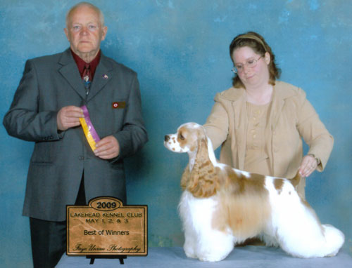 Emmitt is a very pretty red & white boy, beautiful head, scissor bite, long neck, smooth shoulders, good topline, well angled rear with nice movement. Emmitt has an outstanding outgoing temperament and enjoys life with Shawna Levesque and her family.